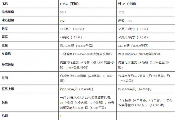 图注:美媒列出的歼-35和F-35C基本参数对比图